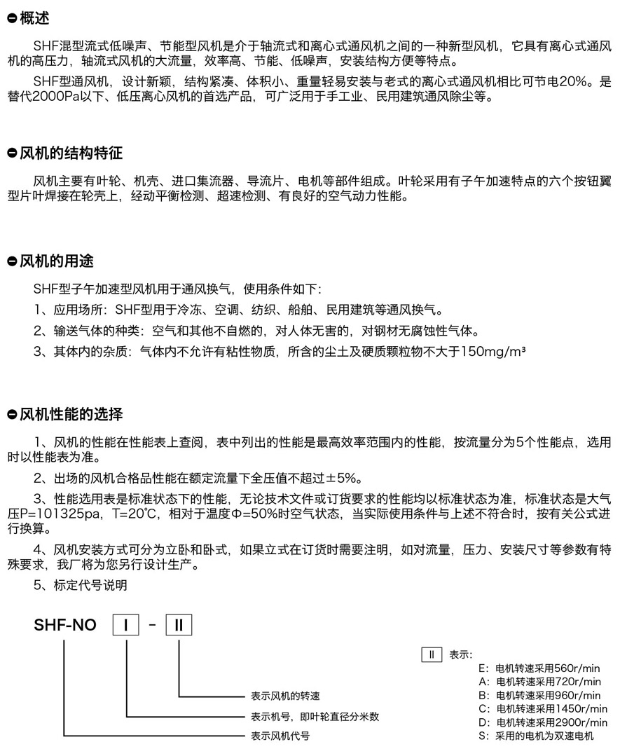 SHF混型流式低噪聲、節(jié)能型風(fēng)機是介于軸流式和離心式通風(fēng)機之間的一種新型風(fēng)機, 它具有離心式通風(fēng) 機的高壓力,軸流式風(fēng)機的大流置,效率高、節(jié)能、低噪聲,安裝結(jié)構(gòu)方便等特點。 SHF型通風(fēng)機,設(shè)計新穎,結(jié)構(gòu)緊湊、體積小、重置輕易安裝與老式的離心式通風(fēng)機相比可節(jié)電20%。