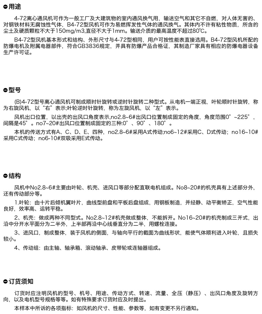 4-72離心通風機可作為一般工廠及大建筑物的室內(nèi)通風換氣用,輸送空氣和其它不自燃,對人體無害的、 對鋼鐵材料無腐蝕性氣體,B4-72型風機可作為易燃揮發(fā)性氣體的通風換氣。 其體內(nèi)不許有粘性物質(zhì),所含的 塵土及硬質(zhì)顆粒不大于150mg/m3,直徑不大于1mm。 輸送介質(zhì)的最高溫度不超過80°C